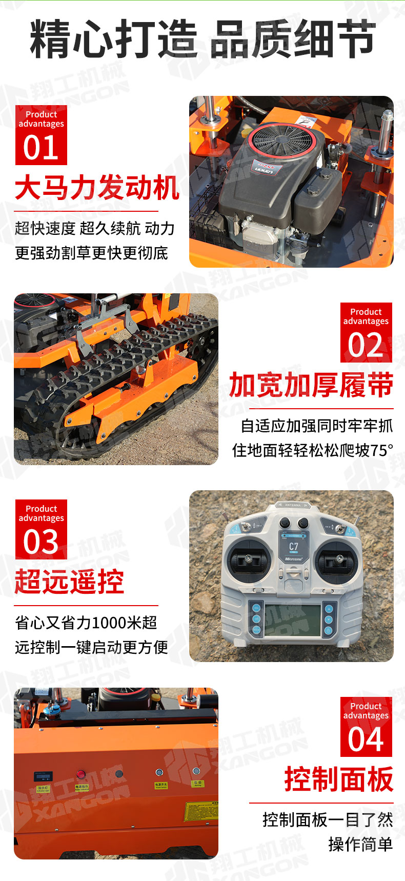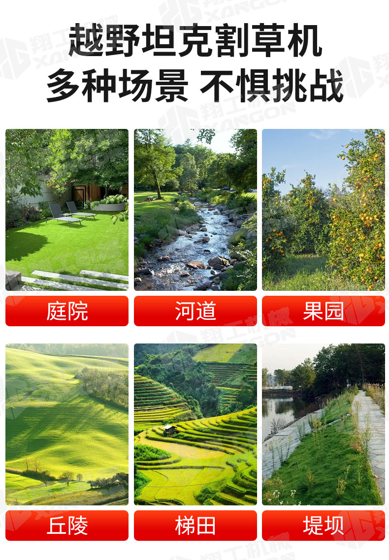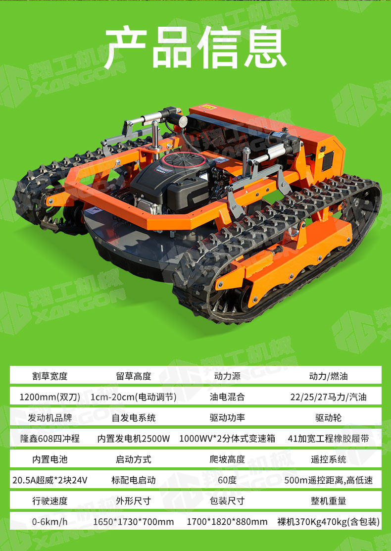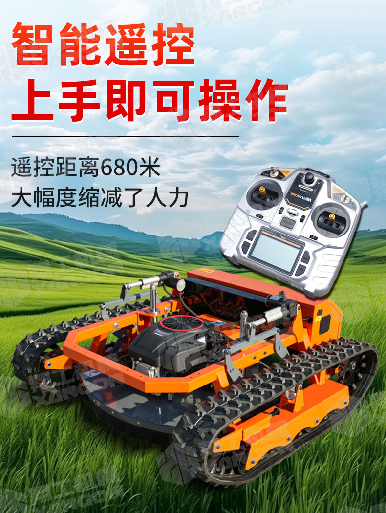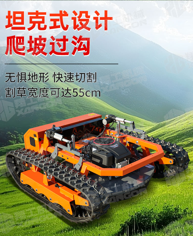 XG-1200是一款革新性的遙控坦克割草機(jī),專為復(fù)雜地形設(shè)計(jì)。其獨(dú)特的橡膠履帶底盤,具備卓越的越野與爬坡能力,輕松應(yīng)對(duì)陡坡、濕滑及不平整草坪。無(wú)線遙控操作,靈活精準(zhǔn),極大提升了割草效率與安全性,是果園、荒地及專業(yè)園藝工作的理想之選。