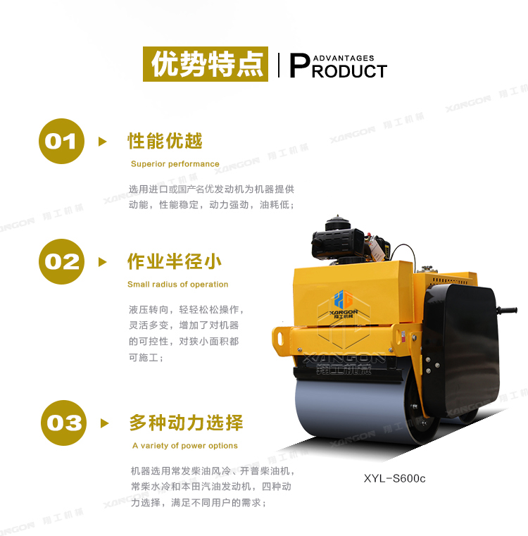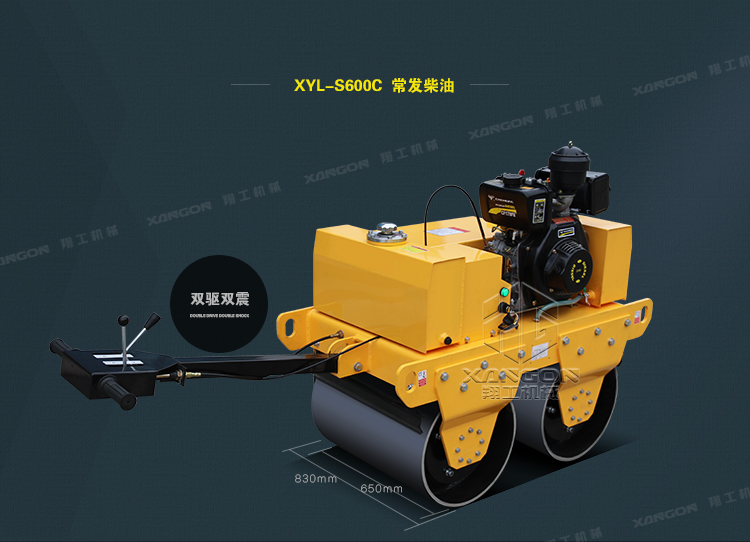 ·柴油動(dòng)力采用電啟動(dòng),輕便靈活換向機(jī)構(gòu);雙驅(qū)雙振,保證了整體的壓實(shí)和爬坡能力;