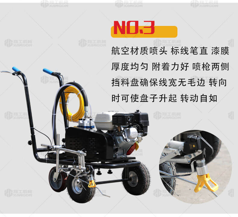 冷噴劃線機(jī)是常溫標(biāo)線施工的專用設(shè)備。主要適用于公路、市區(qū)停車場、機(jī)場等涂劃直線、虛線、曲線、斑馬線、文字、箭頭、圖形標(biāo)志等。形成高壓進(jìn)行噴涂,流量大、壓力穩(wěn)。所劃標(biāo)線線型清晰、附著力強(qiáng)、厚薄均勻、邊齊角齊。具有操作靈活、工作效率高、施工快捷方便、應(yīng)用范圍廣等特點(diǎn)。