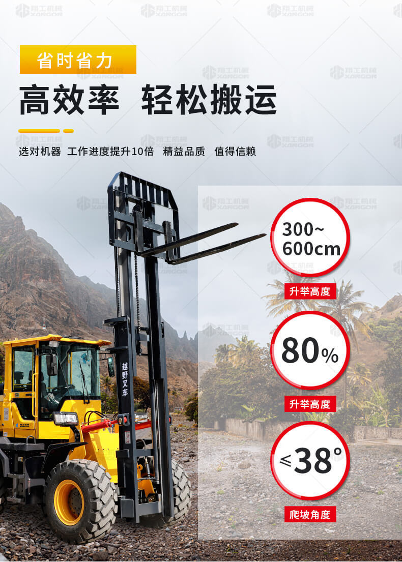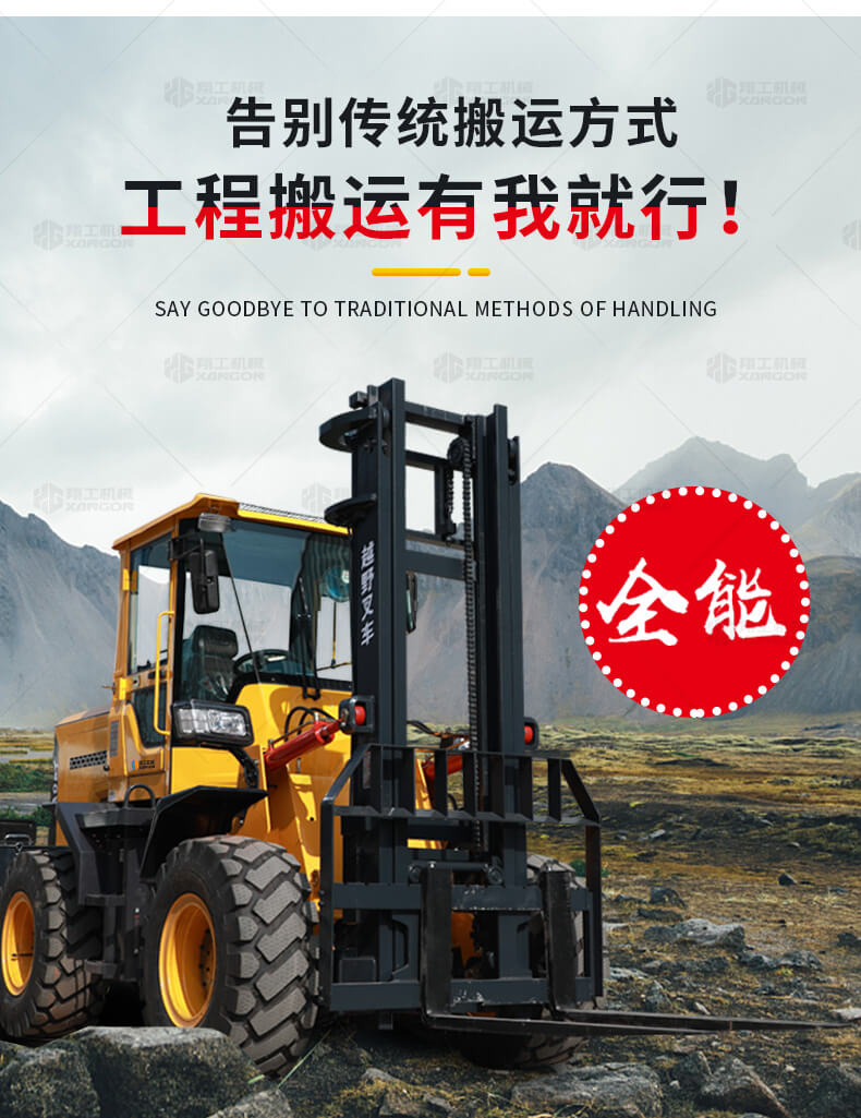 越野叉車適用于道路修筑、城市建設、環(huán)境衛(wèi)生、石料場、中小型土木工程、車站、碼頭、貨場、倉庫等地方,主要用來轉運石料、設備、貨物、城市垃圾箱以及集裝物料等。