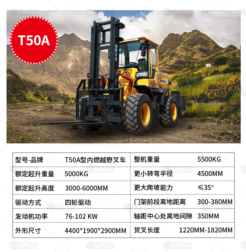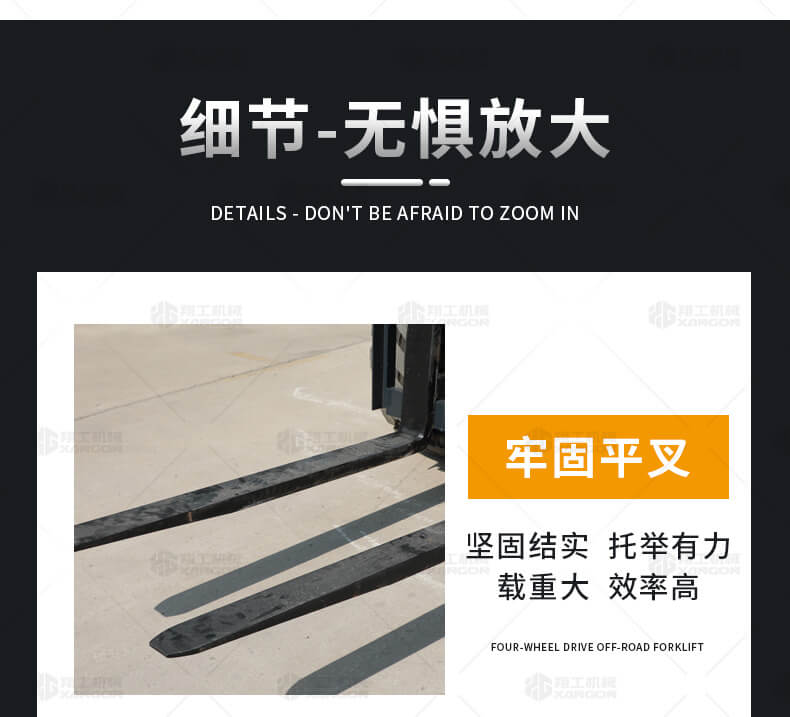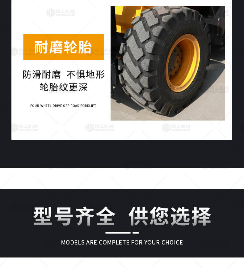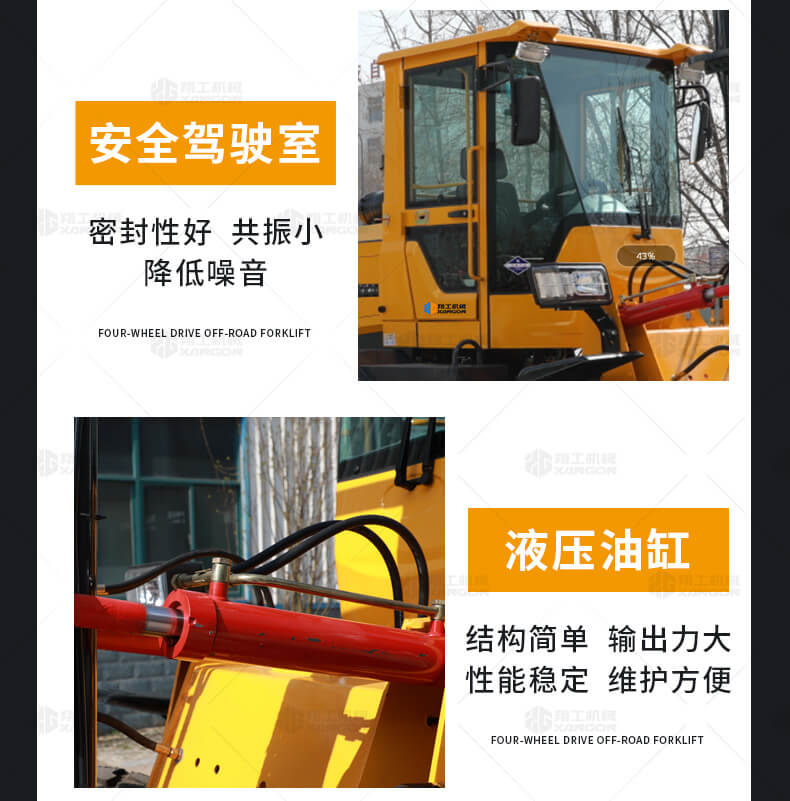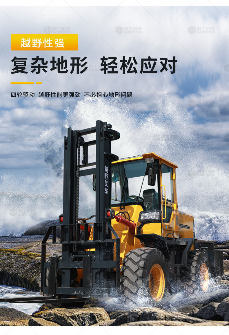 5.越野叉車發(fā)動機功率大,采用全輪驅動和越野輪胎。