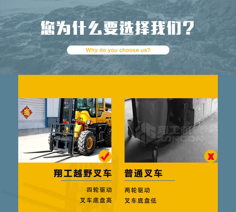 3.普通叉車只能在平整的路面上作業(yè),而越野叉車既可以在普通路面上作業(yè),還可以在山路泥路崎嶇道路作業(yè),輪胎抓地力強(qiáng),不打滑。