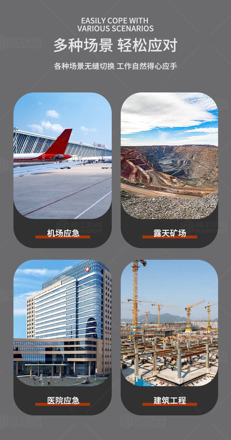 090型工程照明車用于體育場(chǎng)館、機(jī)場(chǎng)、碼頭等大型公共場(chǎng)所, 公路、鐵路、電力等緊急搶險(xiǎn)現(xiàn)場(chǎng),露天采礦現(xiàn)場(chǎng), 以及防洪防汛、搶險(xiǎn)救災(zāi)現(xiàn)場(chǎng)等其它需要緊急備用光源、電源的場(chǎng)合
