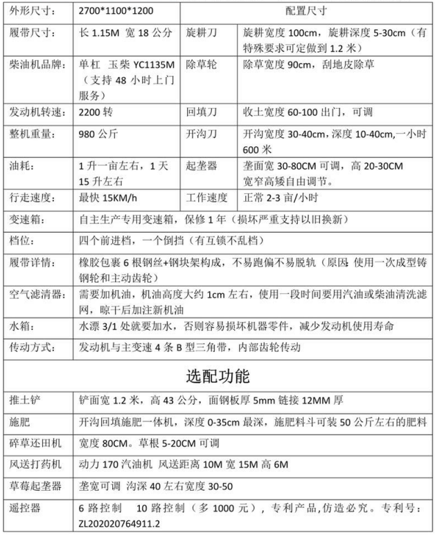 選配:推土鏟、施肥器、打藥機(jī)、碎草機(jī)等