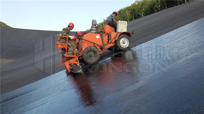 瀝青封閉層的施工采用適合于斜坡施工的專(zhuān)用瀝青瑪蹄脂涂刷機(jī),在牽引臺(tái)車(chē)的牽引下沿著面板從下往上涂刷。涂刷完一個(gè)條帶后,將涂刷機(jī)移動(dòng)至下一個(gè)條帶繼續(xù)涂刷。瑪蹄脂封閉層涂刷作業(yè)時(shí)環(huán)境氣溫應(yīng)在10℃以上,涂刷溫度一般在170℃~190℃;施工完成的封閉層表面禁止無(wú)關(guān)人員和機(jī)械行走;特殊部位:壩頂及曲率半徑較小的圓弧斷,采用小型機(jī)械涂刷方式進(jìn)行機(jī)械涂刷進(jìn)行,環(huán)庫(kù)水平段及弧段全部采用小刮涂機(jī)配合人工進(jìn)行刮涂施工。