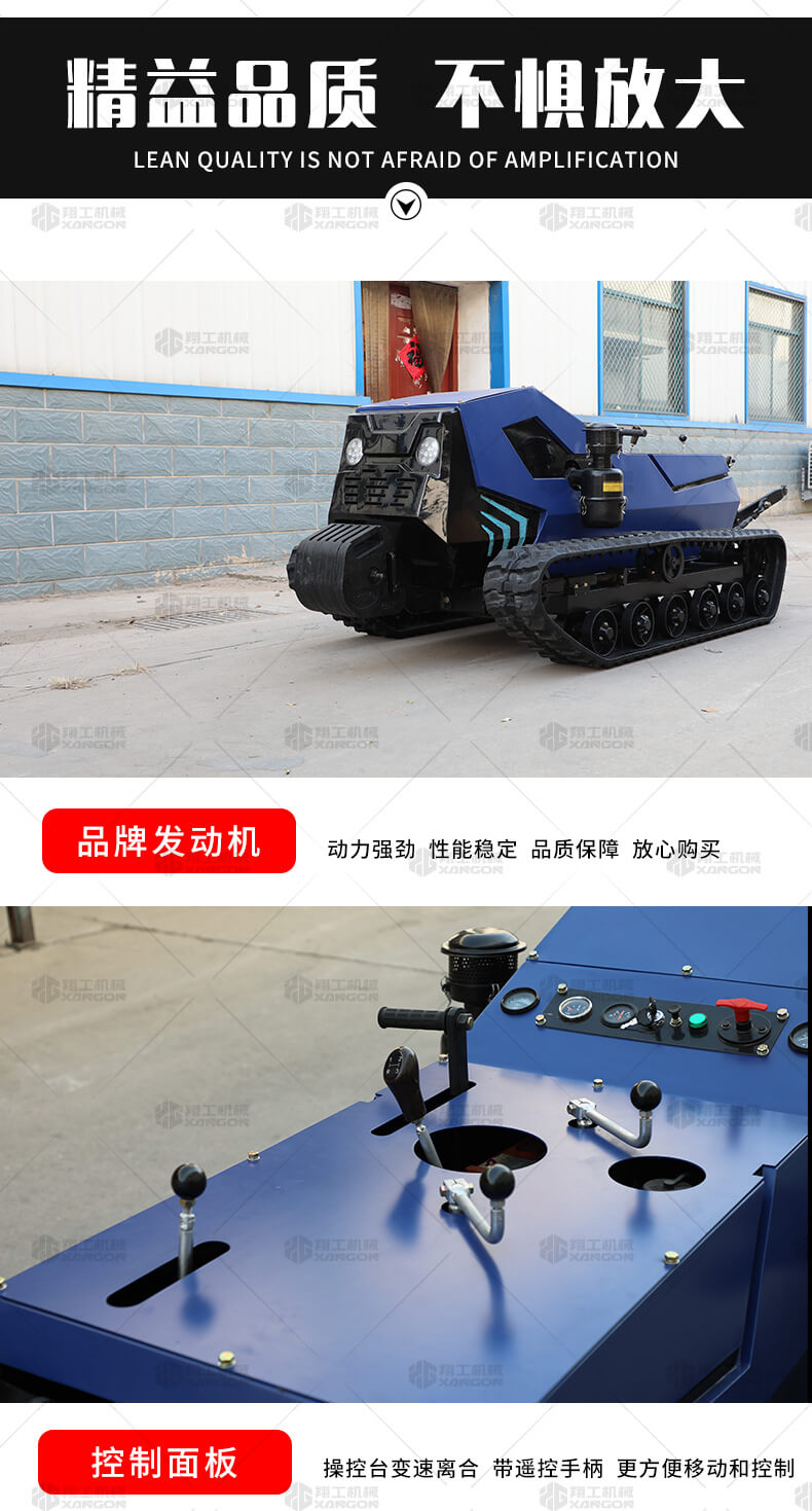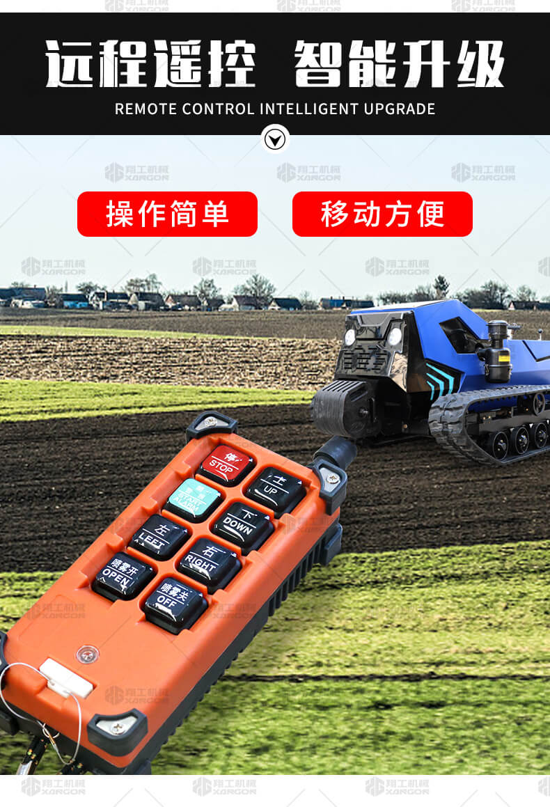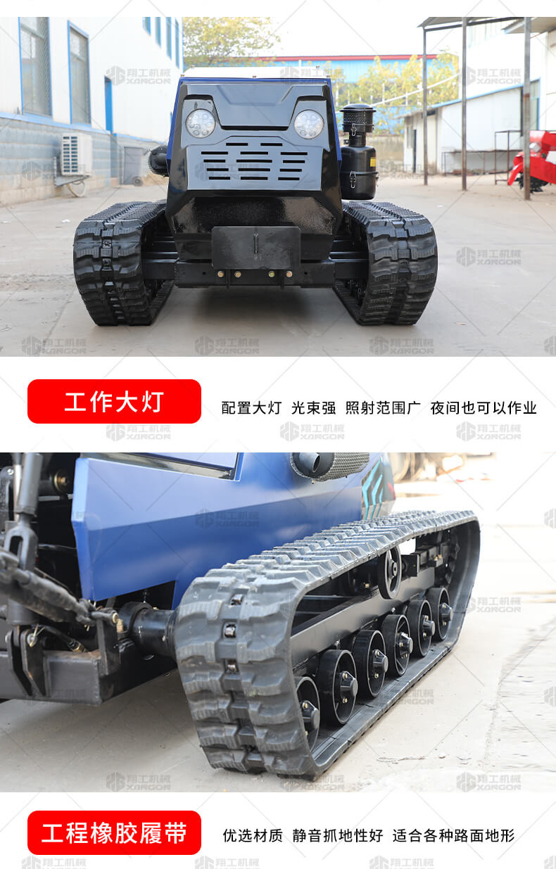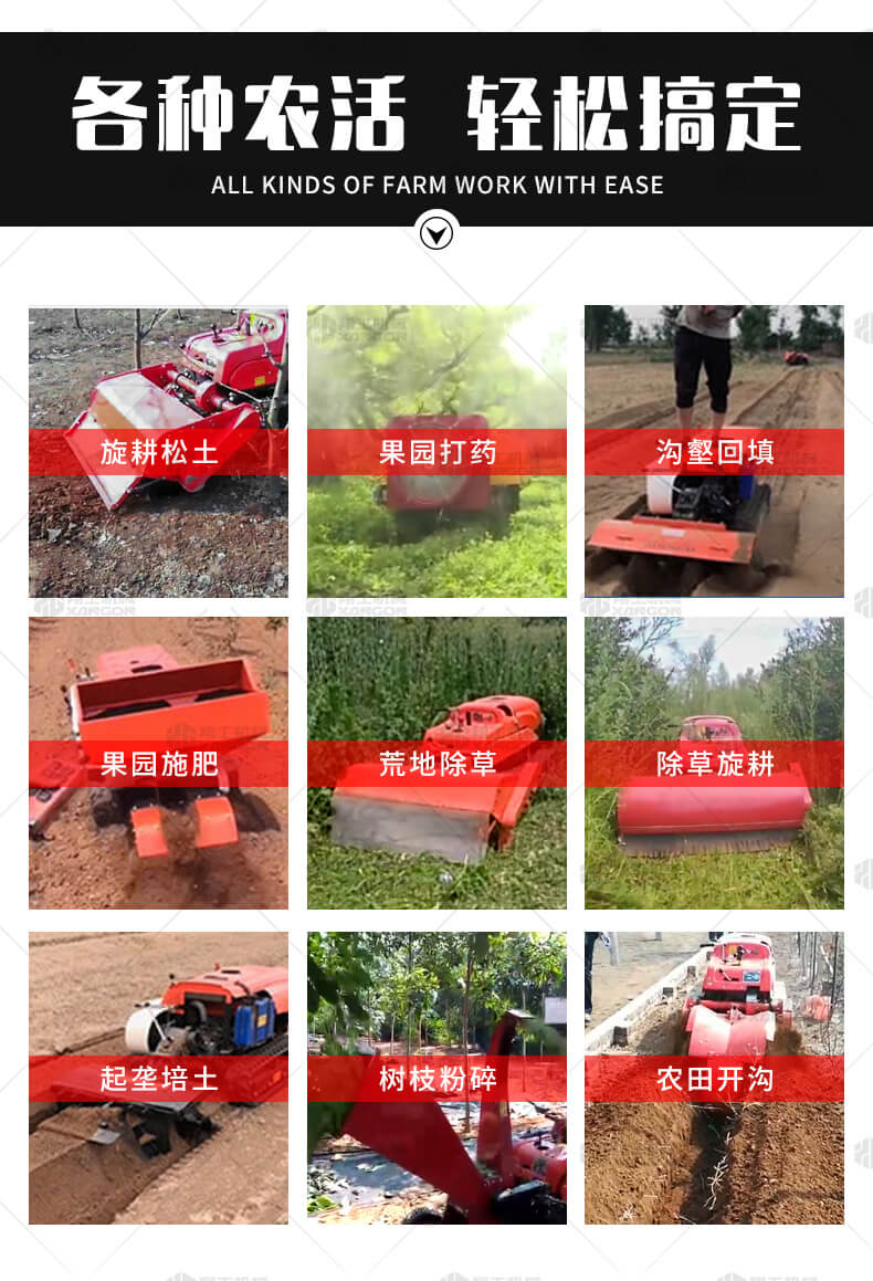 本產(chǎn)品采用履帶式驅(qū)動設計,穩(wěn)定性和爬坡能力較強,適應丘陵山地平原各種地形,機型小功率大,適應各種行距的果樹,大棚,園林。產(chǎn)品動力強勁,結(jié)實耐用,性能優(yōu)越,安全放心,遠程操控,省心省力。