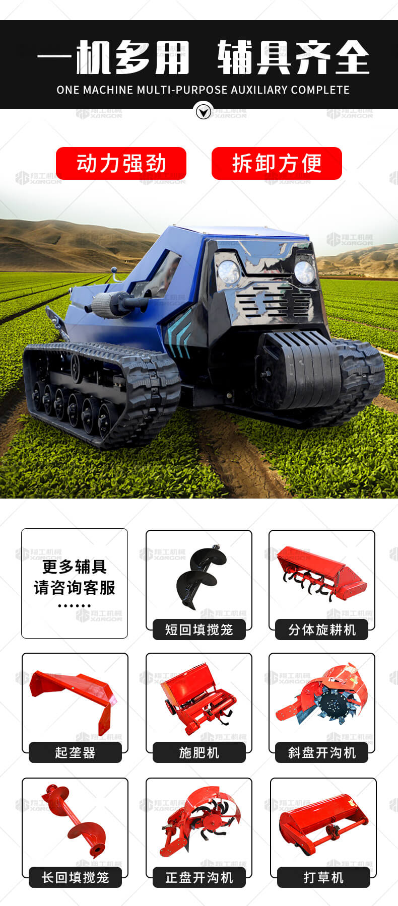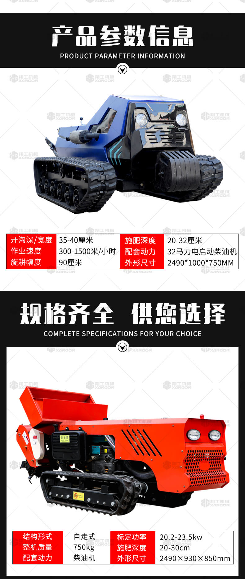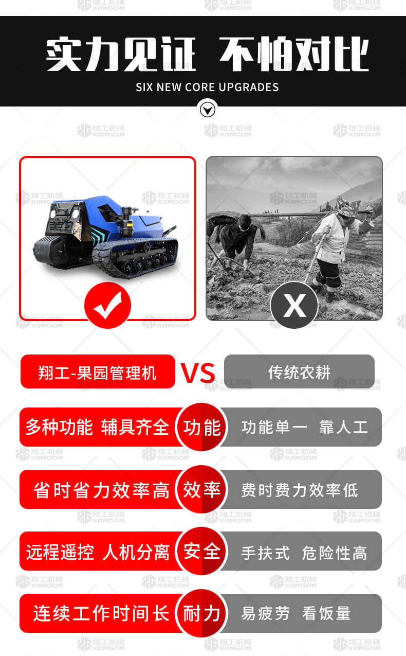 本產(chǎn)品采用履帶式驅(qū)動設計,穩(wěn)定性和爬坡能力較強,適應丘陵山地平原各種地形,機型小功率大,適應各種行距的果樹,大棚,園林。產(chǎn)品動力強勁,結(jié)實耐用,性能優(yōu)越,安全放心,遠程操控,省心省力。