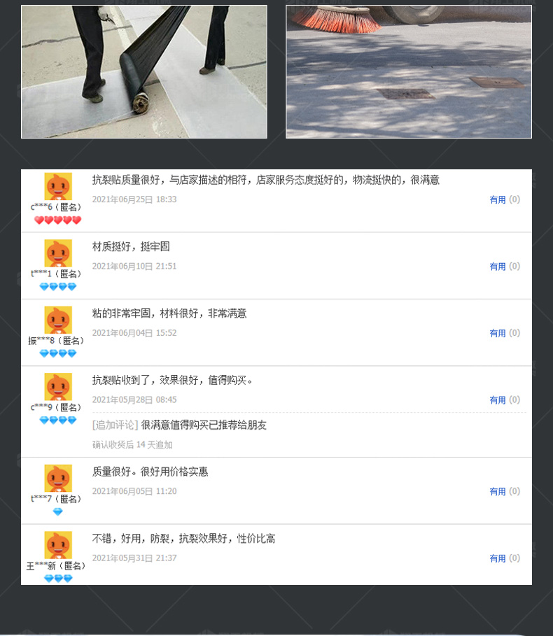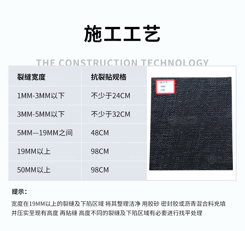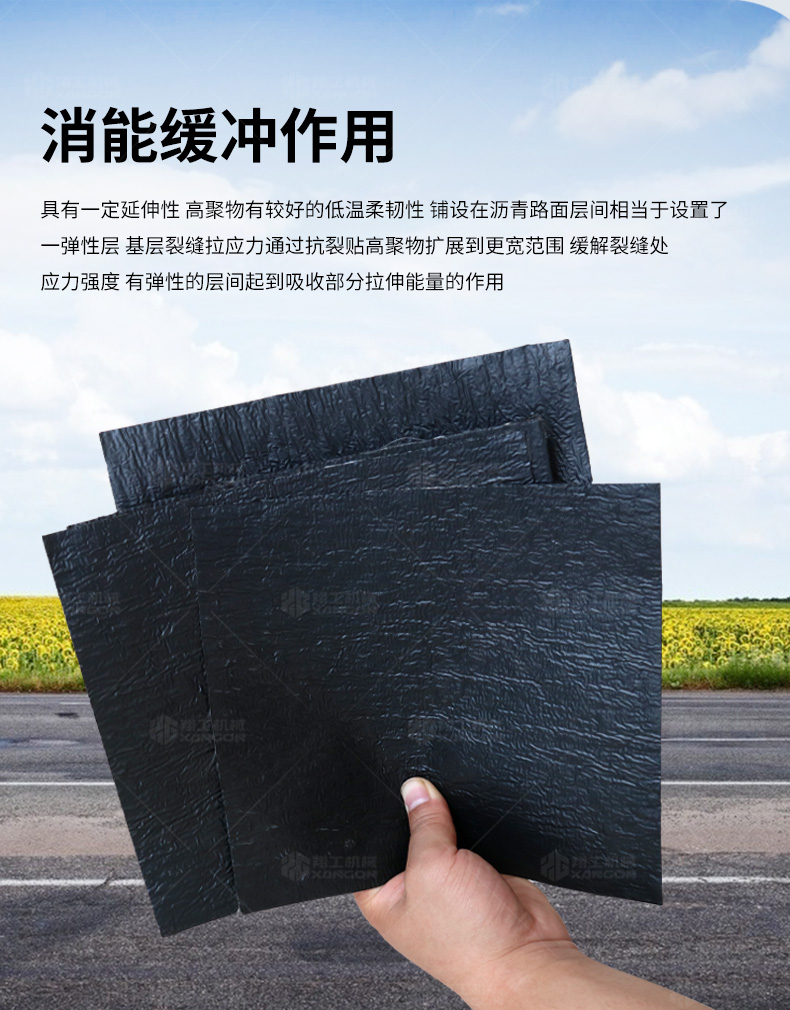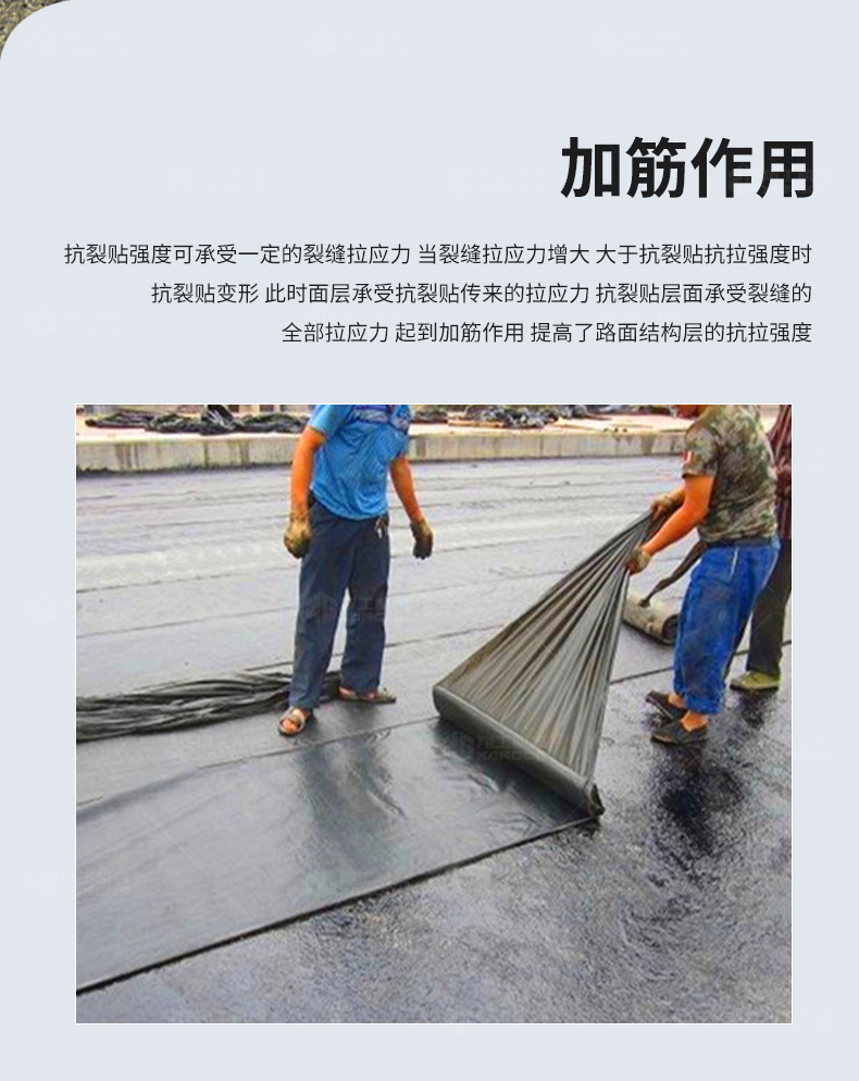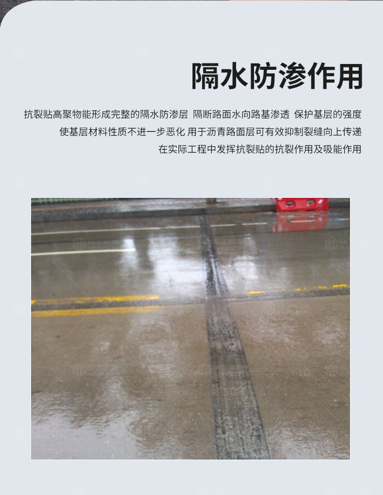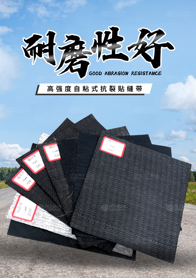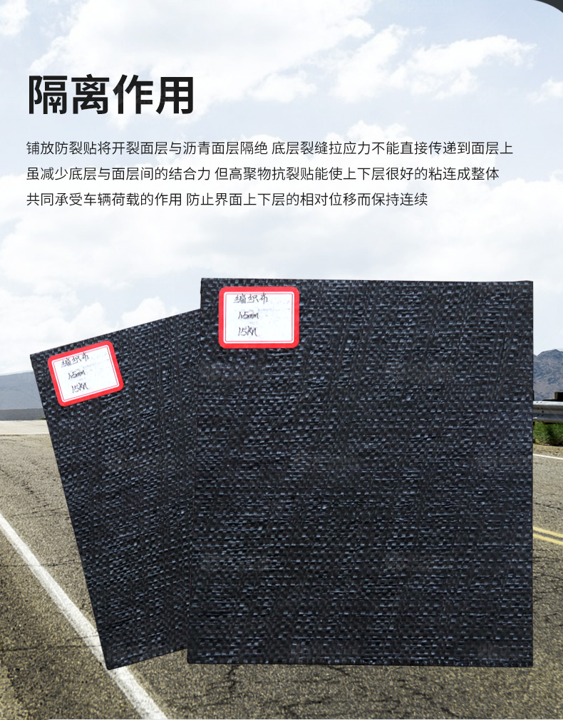 防裂貼(又稱抗裂貼)是由瀝青基的高分子聚合物、抗拉胎基、耐高溫并與瀝青相容的織物復(fù)合而成。將其貼于產(chǎn)生裂縫或剝落的瀝青混泥土面,能減少并阻隔其作用于路面的溫縮應(yīng)力,因此也減少了裂縫反射穿過面層的趨勢,鋪設(shè)與路面因其將基層與上部磨耗層隔離開來,從而使上面層免受多向位移及剪切應(yīng)力的影響,用于公路、橋梁、機場等。