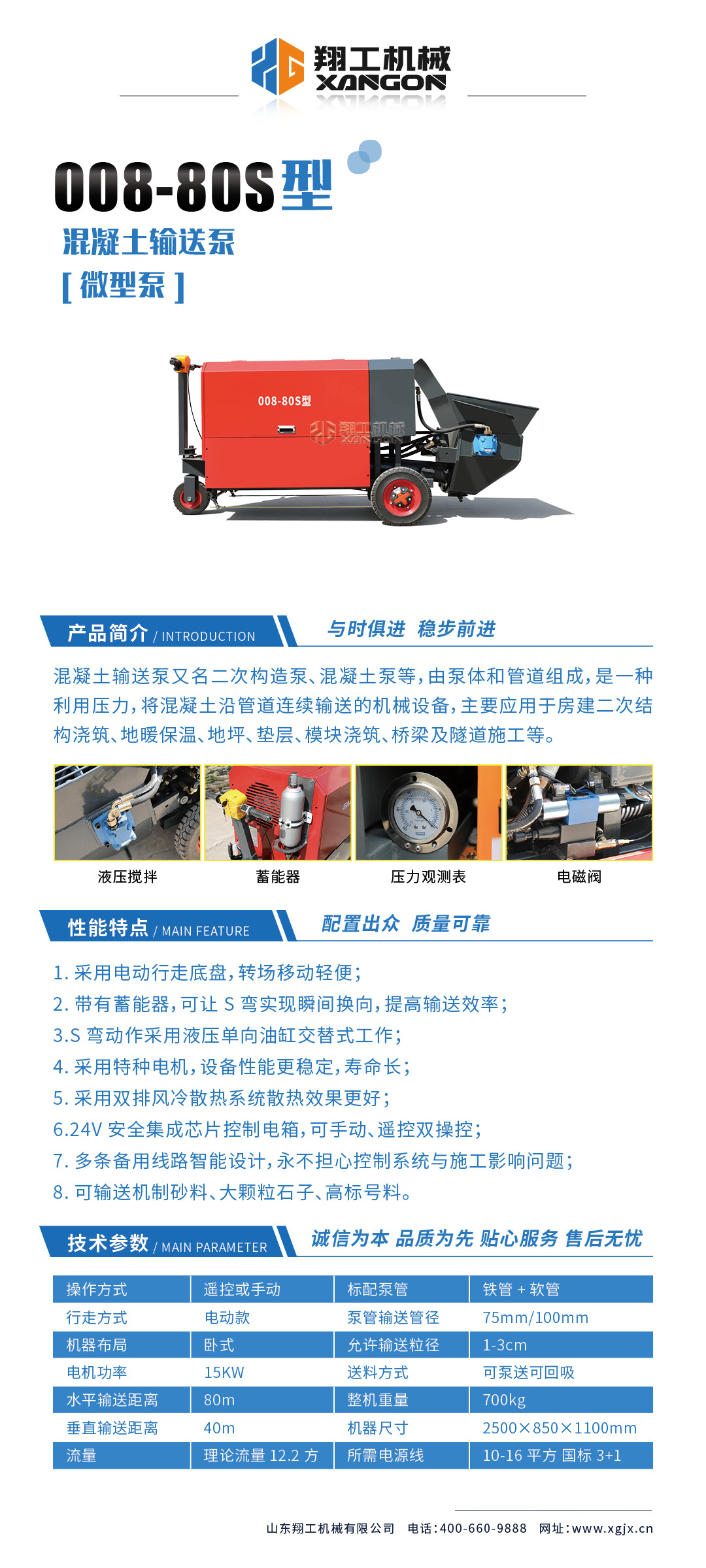 采用電動行走底盤移動更輕便,采用雙排風(fēng)冷散熱系統(tǒng)散熱效果更好,液壓系統(tǒng)采用國內(nèi)知名廠商葉片泵,故障率低,壽命更長,性能更穩(wěn)定,輸送距離更遠(yuǎn)揚(yáng)程更高,打料速度更快。