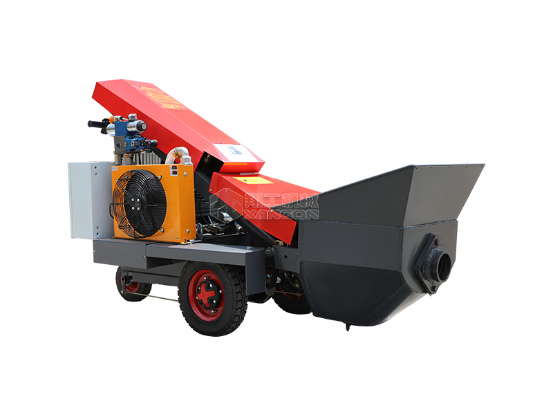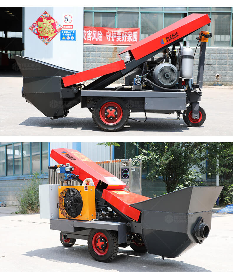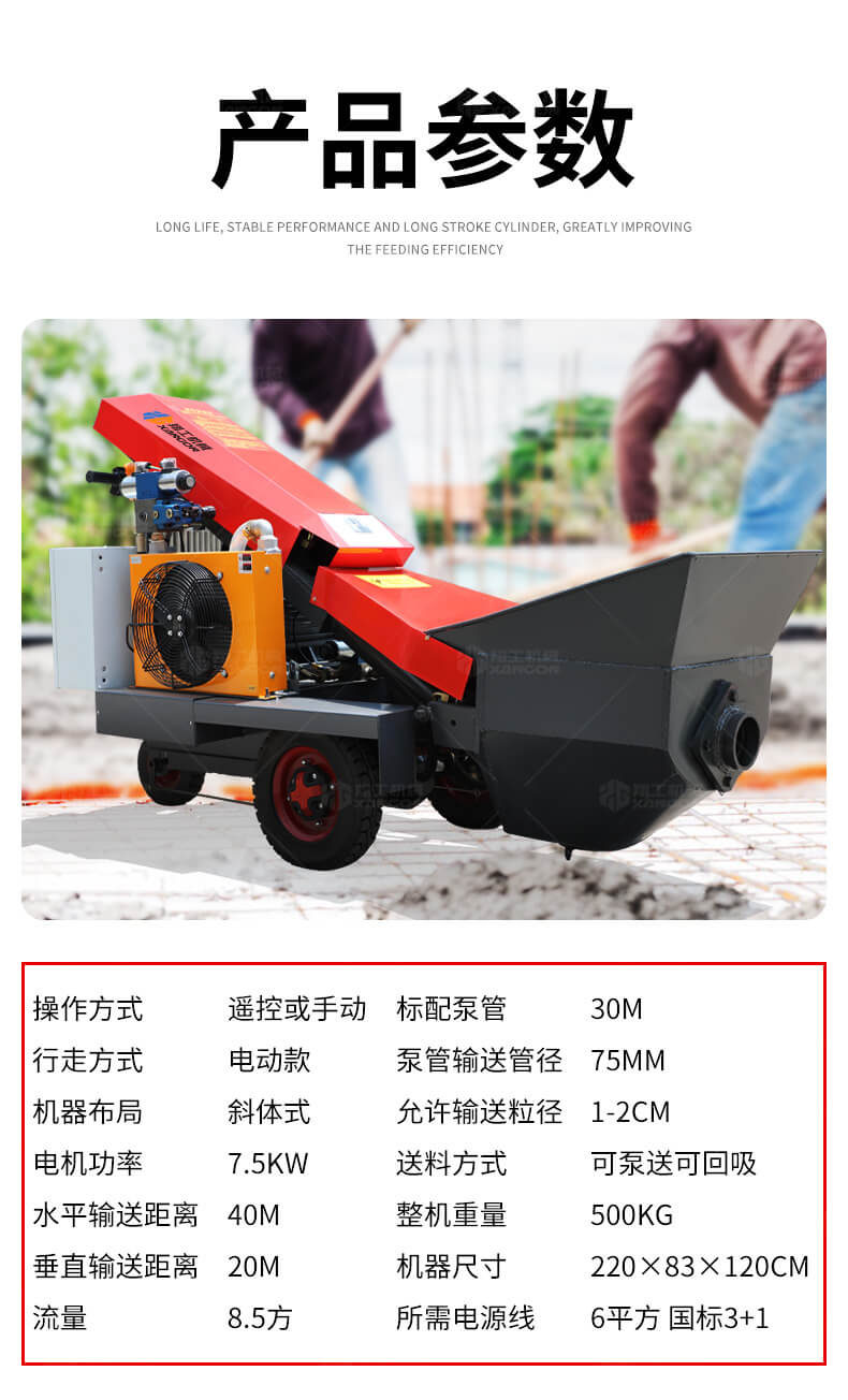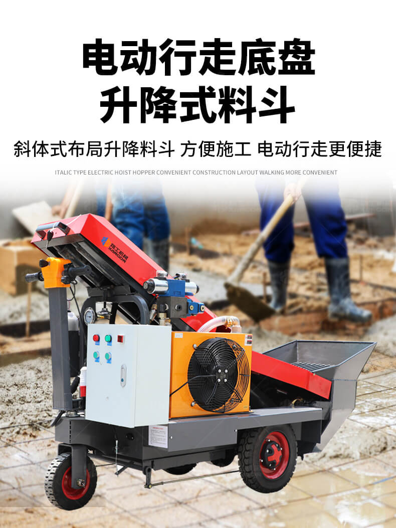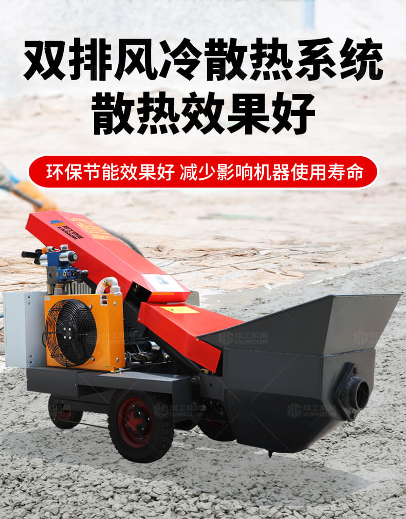 采用電動(dòng)行走底盤(pán),斜體式布局升降料斗,采用雙排風(fēng)冷散熱系統(tǒng)散熱效果更好,液壓系統(tǒng)采用國(guó)內(nèi)知名廠商葉片泵,故障率低,壽命更長(zhǎng),性能更穩(wěn)定,超長(zhǎng)行程料缸大大提高了輸送效率。